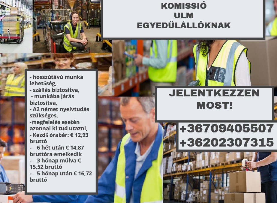 Németországi partnerünk megbízásából keresünk Baden-Württemberg tartományba Ulm városába, komissiós munkatársakat, egyedülálló férfiak vagy hölgyek személyében. Jelentkezni lehet: fényképes önéletrajzzal, megjelölve mikor tud Németországba utazni, pár napon belül. A kiutazás, önállóan önköltségen történik a kapott címre.