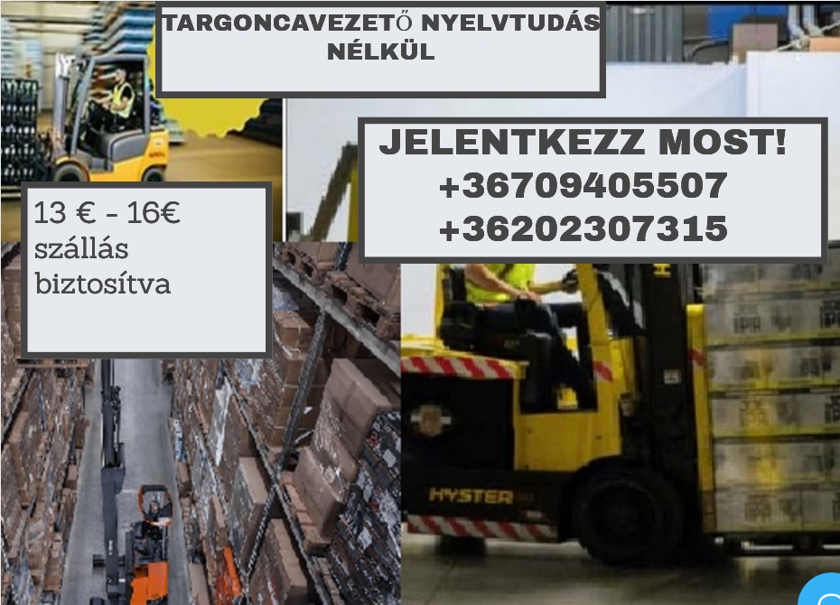- Nagy targoncás (fülkés, motoros), tapasztalat feltétel: bruttó 14€/óra