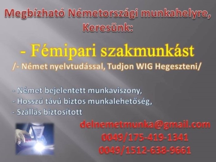 Megbízható Németországi Munkahelyre, Keresünk : Fémipari Szakmunkást /Tudjon Wig Hegeszteni/, német nyelvtudással.