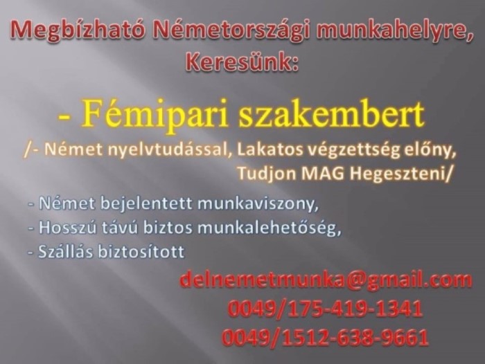 Megbízható Németországi Munkahelyre, Keresünk : Fémipari Szakembert /Tudjon Mag Hegeszteni, Lakatos végzettség előny/, német nyelvtudással.