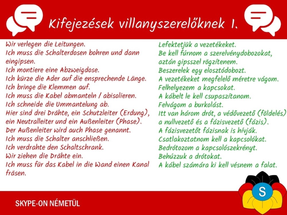 nyelvleckék, tananyagok, kifejezések, villanyszerelőknek