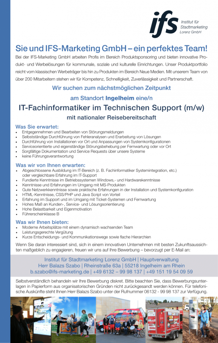 Bei der IFS-Marketing GmbH arbeiten Profis im Bereich Produktsponsoring und bieten innovative Produkt-und Werbelösungen für kommunale, soziale und kulturelle Einrichtungen. Unser Produktportfolio reicht vom klassischen Werbeträger bis hin zu Produkten im Bereich Neue Medien. Mit unserem Team von über 200 Mitarbeitern stehen wir für Kompetenz, Schnelligkeit, Zuverlässigkeit und Partnerschaft.