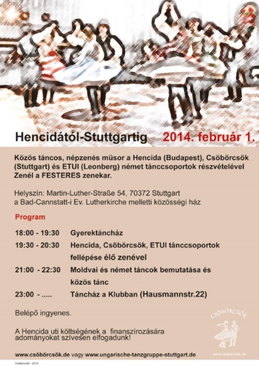 Közös táncos, népzenés müsor a Hencida (Budapest), Csöbörcsök (Stuttgart) és ETUI (Leonberg) német tánccsoportok részvételével. Zenél a FESTERES zenekar.