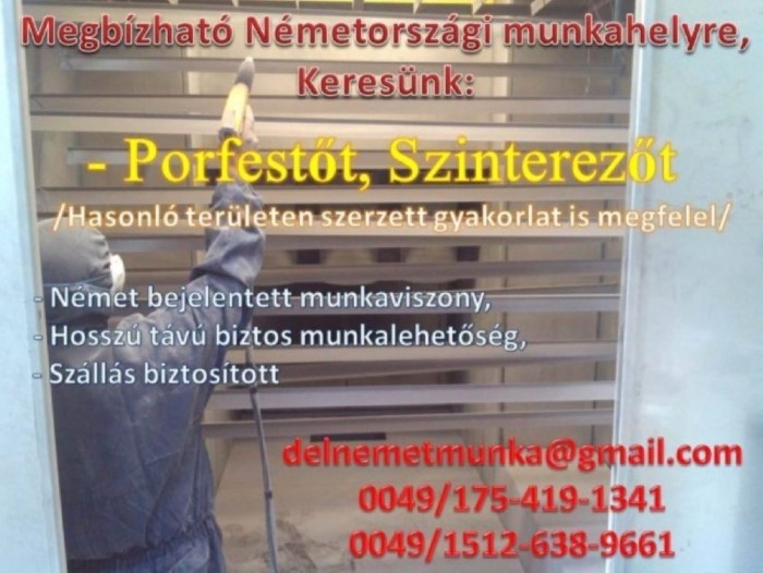 Németországi munkahelyre, keresünk: - Porfestőt, Színterezőt (Autófényezés, Ipari festés, Porfestés területen szerzett gyakorlat is megfelel) A2 szintű német nyelvtudással! - Német bejelentett munkaviszony, - Hosszútávú munkalehetőség, - Szállás biztosított! Önéletrajzokat a delnemetmunka@gmail.com-ra várunk! 0049/175-419-1341, 0049/1512-638-9661