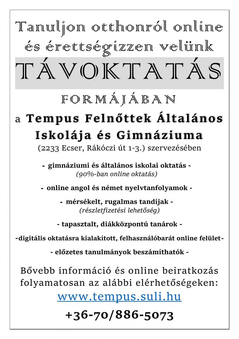 Továbbtanulni vágyók! Érettségire készülők! Itt az idő!!! Szeptemberben indítjuk távoktatásos képzésünket, online rendszerben. Személyes megjelenés csupán a vizsgákon illetve az érettségin. Keress fel minket bizalommal!!!