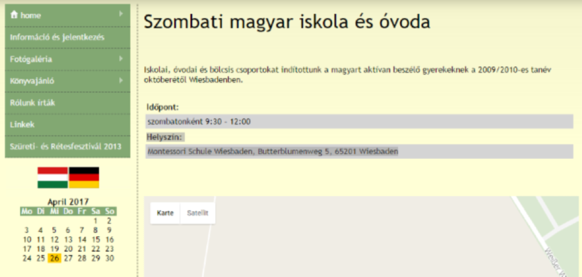 Beküldő: Admin, 26 április, 2017 Hessen Wiesbaden Butterblumenweg 5, 65201 Wiesbaden Helyi közösségek Iskola Óvoda - mail@lv-hungarolingua.de http://www.lv-hungarolingua.de/ungarisch/ A hozzászóláshoz regisztráció és bejelentkezés szükséges