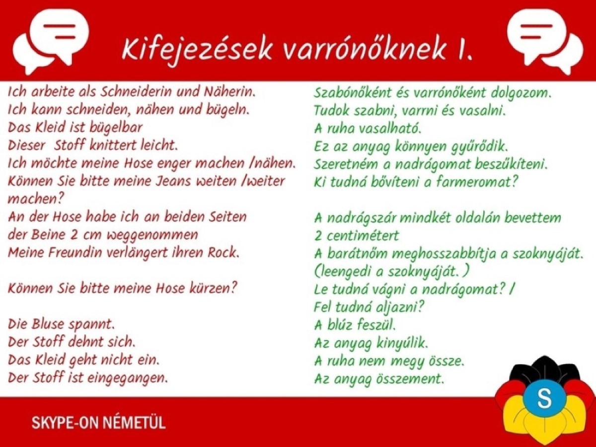német nyelvleckék, tananyag, kifejezések, varrónőknek