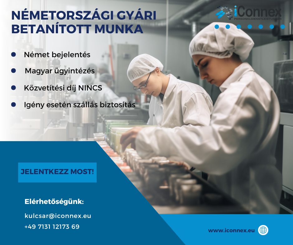 Nyelvtudás nem szükséges az állás betöltéséhez, saját autó viszont igen, a munkába járás miatt. Német bejelentett munkaviszony, igény esetén szállás biztosítással. Párok esetén az azonos műszak megoldható.