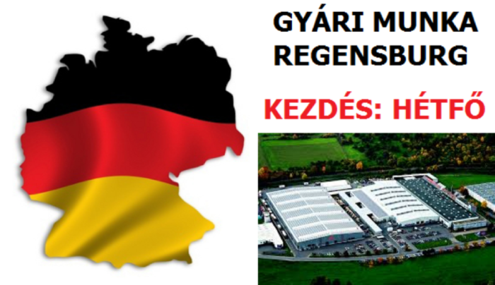 Németországba Regensburgtól nem messze (Budapesttől 650 km) keresünk gyári munkásokat egy autóterminálba. A munkavégzés német munkaerő kölcsönző cégen keresztül, német bejelentéssel történik a német jogszabályoknak megfelelően. 1100-1200 EUR fizetést kínálunk, melyhez a pótlékok és túlóra jön hozzá. A munkahely mellett szállást is intézünk, panzió jellegű szállásokon 200-300 EUR összegért. További információ: www.nemetmunkahely.hu